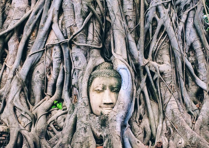 ■仏像の頭部が木の根に覆われた光景