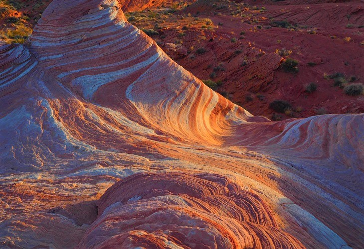 ひときわ目立つ異色の砂漠。バレーオブファイアーは約1,500万年前に起こった大地の堆積、隆起、そして雨と風による侵食によって生まれた真っ赤な岩岩が続くネバダ州最初の州立公園。