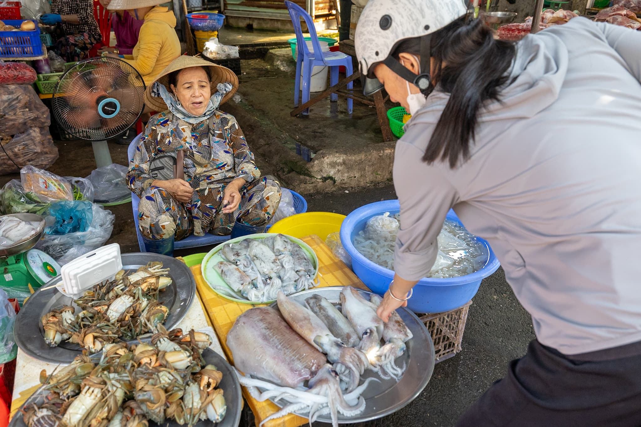 ニャチャン最大の公設市場であるDam市場は地元の人の生活の中枢です。国内でも比較的規模が大きい上に、海の町ニャチャンらしく魚介と、ベトナム屈指の野菜の産地ダラットから降りて来るフレッシュな野菜など高級レストランのシェフも一目置くマーケットを散策します。