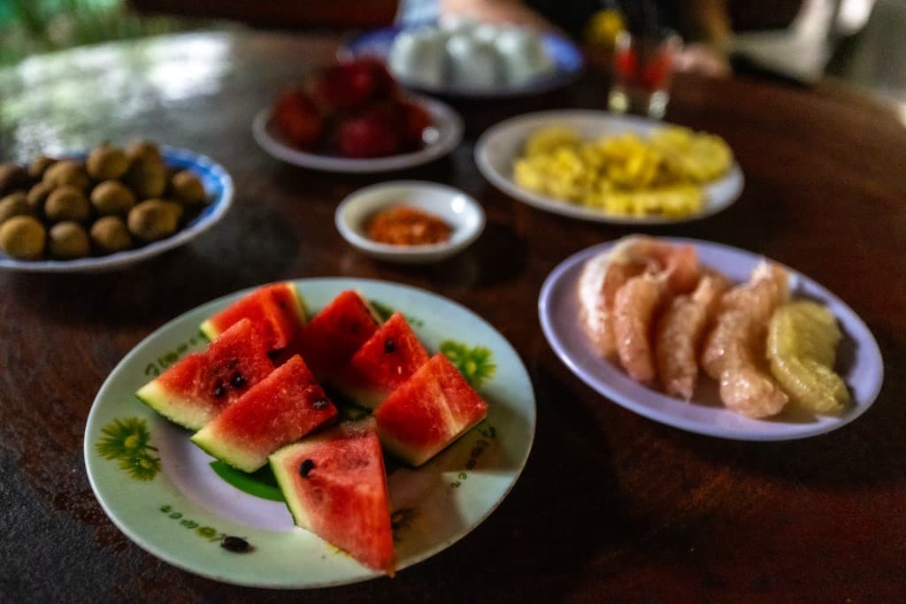 メコンデルタ地域の地元のフルーツがふるまわれ、伝統楽器の演奏とともにお楽しみいただけます。