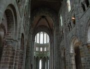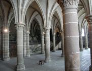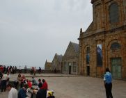 トイレを過ぎて少し歩くと、西のテラス(写真左)に着きます。拭き抜けのテラスになっているのでモンサンミッシェル湾を一望できます。ここで少し景色を堪能しました。(写真中央)