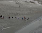 干潟ウォーキングをする人々(写真:左) 今回のオプショナルツアーは、バスが汚れる関係で靴を履いたまま干潟ウォーキングが出来なかったのですが、やってみたい方は裸足で入ってみてください。しかし、かなり粘土質で足が抜けなくなることもしばしば。 入られる際はご注意あれ!