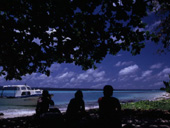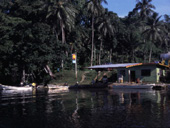 町やホテルは島の北側に位置しますが、南側のポイントに出るときは、冒頭にお話した空港の島と本島の間を抜けてゆきます。 ここは水路のようになっていて両側には豊かなマングローブに時々錆びた人工物が目に止まりますが、 これらは第2次大戦中の遺物だそうです。またこの水路の空港の島と本島を結ぶ橋のたもとには、シェルの看板のついた 船用のガソリンスタンドがありました。がここは最近閉店したそうで、今は人々の談話の場所になっているようです。