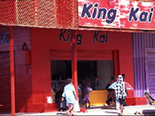 (写真:右) スーパーに隣接した真っ赤なカイバー (ファーストフードショップ)