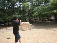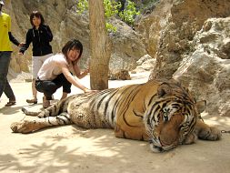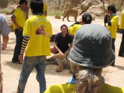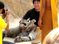お坊さんと虎とは、日々生活を共にしているから信頼関係が成り立っているのでしょうが、やっぱり私達は安全には十分注意を払わなくてはいけません。寺に入る前にも何かあっても自己責任ですよという書面にサインをします。タイガーキャニオンでの写真撮影の際は、カメラのシャッターなどに虎が興奮したり、不慮の事故を抑える為に、黄色い服を着たスタッフ達の指示にしたがいます。