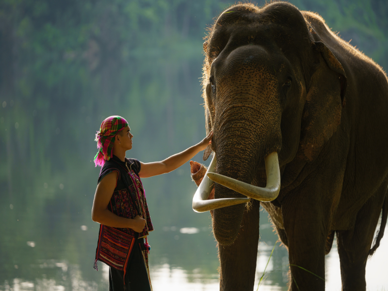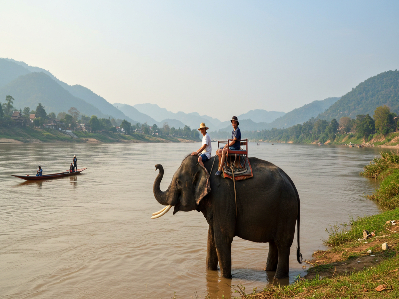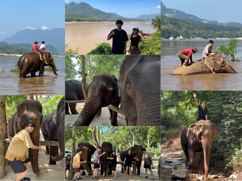 象に餌をあげたり、背中に乗ってジャングルのような森の中を散歩したり、広大なメコン川と緑豊かな山々の風景の中で、一緒に水浴びを楽しんだり…。