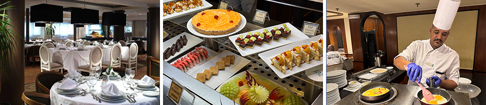 クルーズ船滞在中は朝・昼・夕食の全食事付きで食事には困りません。また、テーブルは滞在中決まった場所が指定されるため席の心配もなし。食事はビュッフェ形式で提供され、朝食時には卵料理、昼食・夕食時にはパスタを調理してくれるスタンドもあります。しっかり野菜も摂れ、その他肉、魚様々な種類の料理を楽しむことができます。滞在中はメニューも変わっていき、毎食でも飽きることなくお楽しみいただけます。また、エジプトでは宗教上の理由から市内のレストランでなかなかお酒は提供されませんが、クルーズ船内にはバーも完備されているため、お酒好きの方も安心です。