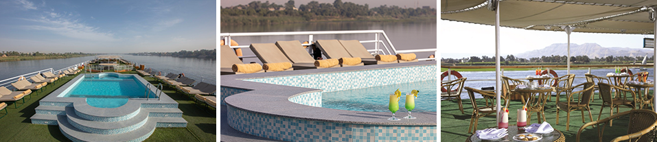 船によって配置や設備が異なりますが、屋上デッキにはプールやビーチチェア、バーカウンターなどが並びます。エジプトの太陽と青空の下、クルーズの移動中や停泊時にはぜひひと泳ぎしてみてはいかがでしょうか。水着は必須アイテムですね。夕暮れ時や離接岸時などは多くの乗客がデッキに集まり、ナイル川の夕景や船が動く様子を眺めながら、思い思いの時間を楽しんでいます。