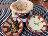ナスの煮物やゴマのペーストをつけていただく平たいパン。多くのお店で複数枚出てくるのでお好きな枚数だけお食べください。