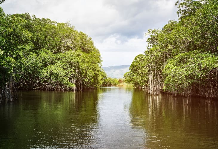 観光船で進むとワニに出会う事もあるマングローブ林。水は透明でも川底が黒い事からその名がついたそう。