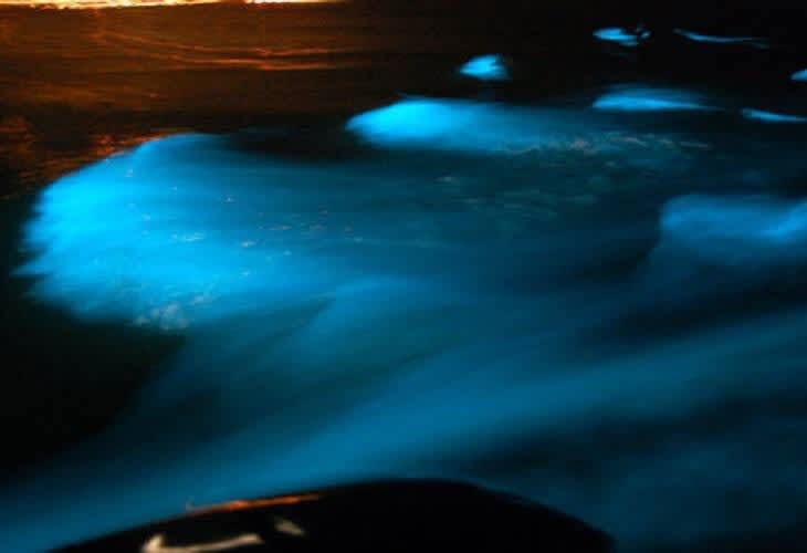 水中に含まれる微生物の力で水色に光る,なんとも神秘的なラグーン。夜の海にボートで繰り出してみては。