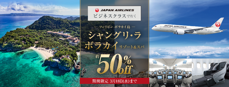 <3月18日迄申込限定│一般価格の約50%OFF>安心の翼JALビジネスクラスで行くアジアNO1ビーチ・ボラカイ島!最高峰リゾート5星『シャングリラボラカイ』今だけお得すぎる極上リゾート旅 5泊8日